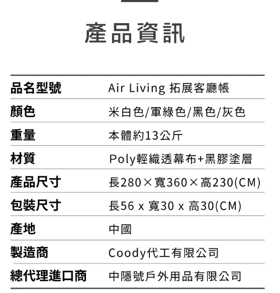 ・長280cm、寬度360cm、高度230cm頂高
