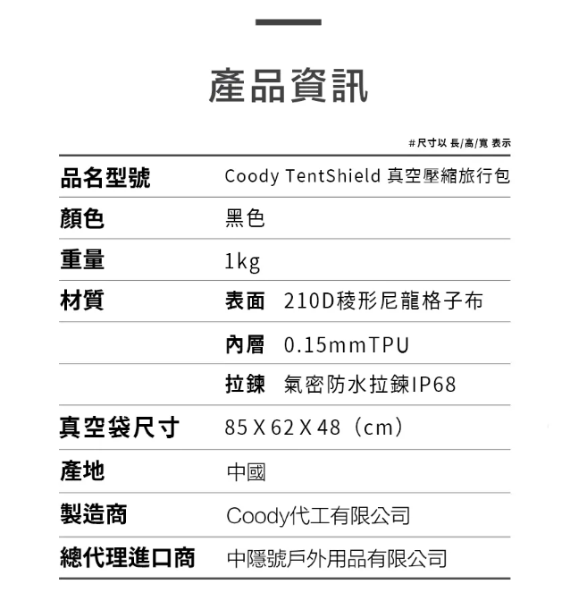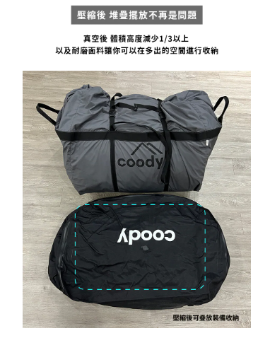 商品詳情 .適用Coody全系列帳篷.氣密防水拉鍊達到IP68防水防塵.釋放更充裕的空間,壓縮30%以上.菱格紋布面設計 美觀又耐用 Coody TentShield 全密閉氣密拉鏈真空壓縮旅行包 (防水防塵等級IP68) TWD $2,880 TWD $2,880